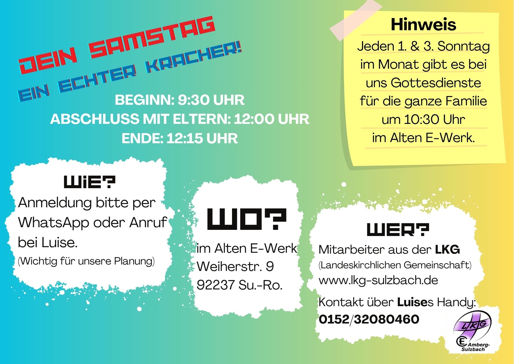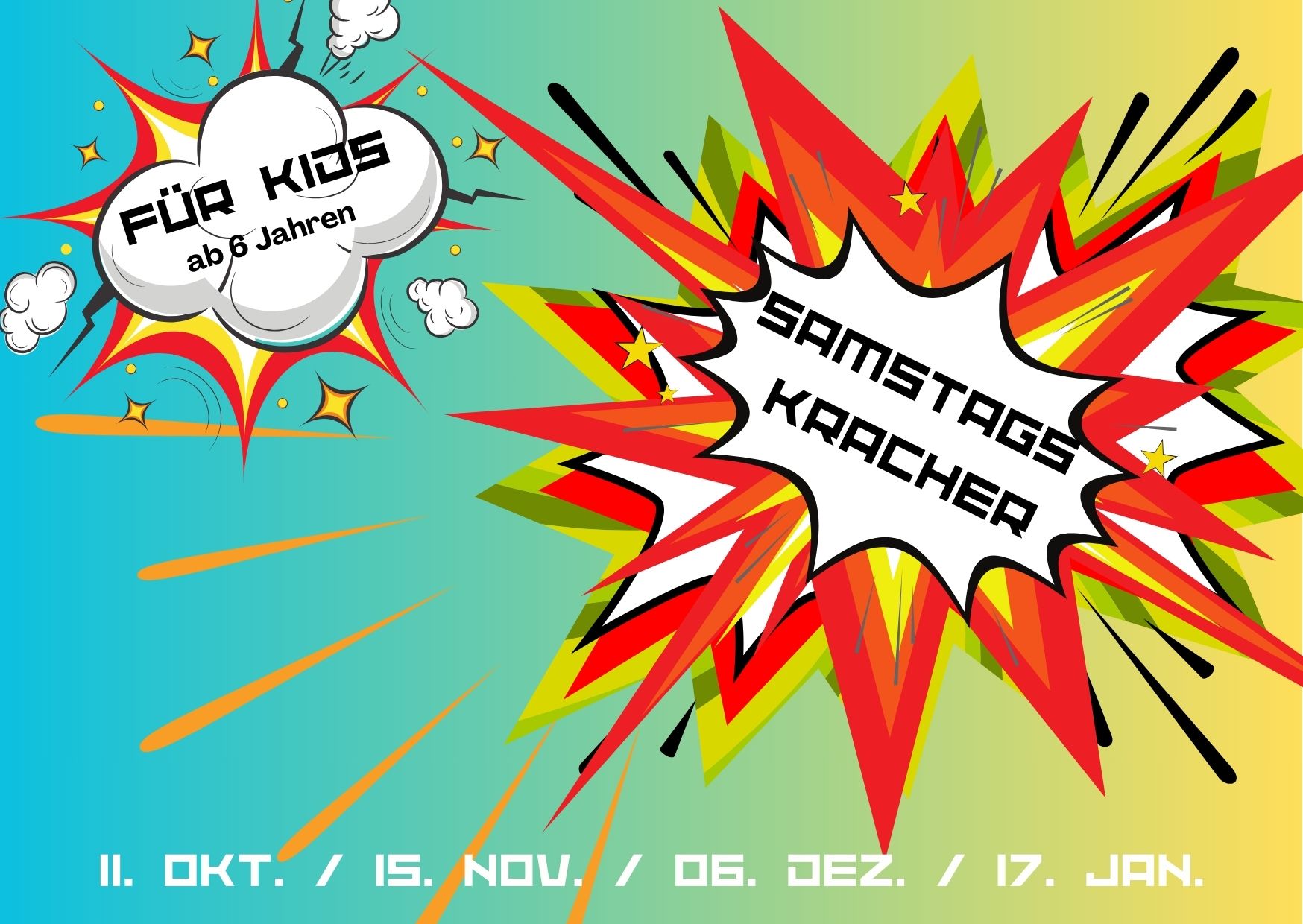 Einmal im Monat sind Kinder ab dem Grundschul-Alter zu einem bunten Vormittag mit Spielen, Liedern, Basteln, Werken und biblischen Geschichten eingeladen um es "krachen" zu lassen. In der Zwischenzeit können Eltern entspannt einkaufen, einen Kaffee trinken, ... Startschuss ist um 09.30 Uhr. Um 12.00 Uhr gibt es einen kleinen gemeinsamen Abschluss mit den Eltern. Offizielles Ende ist dann um 12.15 Uhr.